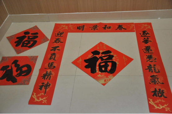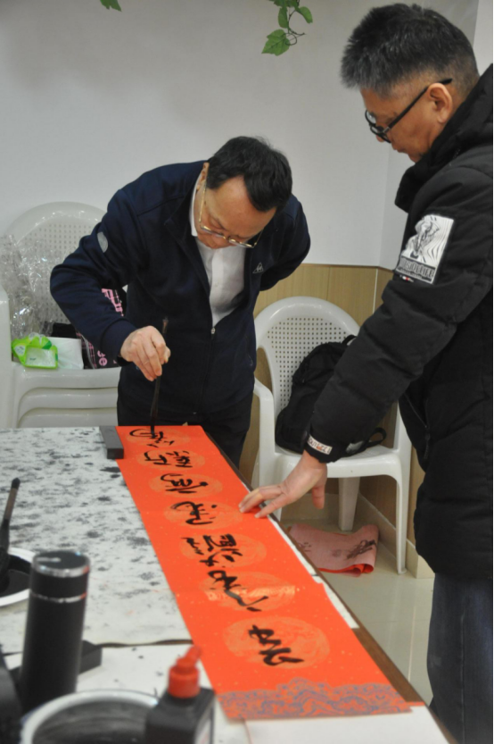 活动现场气氛热烈,墨香四溢。我校离退休人员书法协会的老同志们挥毫泼墨,将美好祝愿凝于笔端。他们一边创作,一边向在场人员讲解春联的文化内涵与吉祥寓意。随着笔锋流转,一个个饱满有力的“福”字、一幅幅寓意深远的对联跃然纸上,既有辞旧迎新的美好愿景,也有对学校发展、社区和谐的真挚祝福。